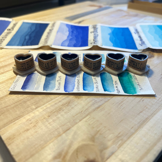 if looking for larger quantities as well as more vibrant synthetic colors like phthalo blue, quinacridone magenta, pyrrol scarlet and more check out our heart shaped half pans which are filled to half pan (2ml) but in reality I overfill them. These pans are an alternative I found to traditional plastic watercolor pans and are made of wheat and biodegradable, plus you can connect them together like a little puzzle.