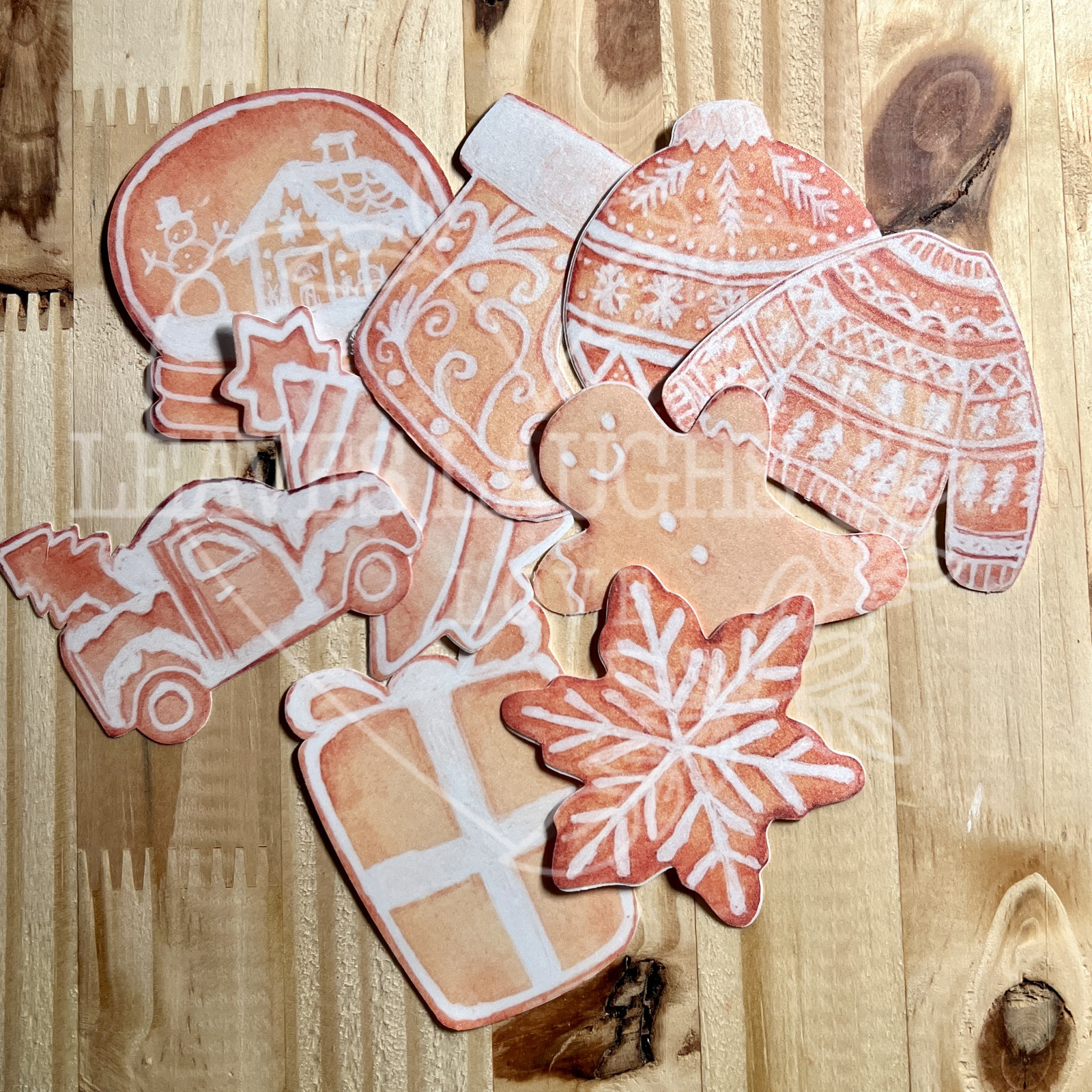 9 Hand painted watercolor gingerbread cookies digitized and printed in sticker form with clear matte laminate for extra protection and longevity. Water resistant but not waterproof. Repositionable not reusable.